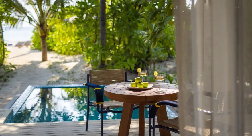 Spacious and Luxurious Beach Pool Villas in the Maldives. Indulge in the ultimate beachfront experience with our private pool villas. Wake up to breathtaking sunrises over the ocean, slide open the glass doors to your outdoor oasis, and step directly onto the soft white sands. Spend your sunny days lazing by your private pool in our adults only resort in Maldives, while your Villa Host serves you refreshing drinks for a perfect luxury holiday.